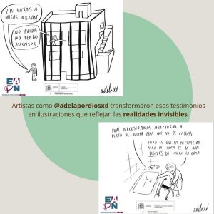 La Red Europea de Lucha contra la Pobreza y la Exclusión Social en el Estado Español está colaborando con ilustradoras e ilustradores, como @adelapordiosxd, para dar voz a través del arte a las conclusiones de su investigación participativa “Envejecimiento, servicios de apoyo comunitarios y entornos inclusivos”