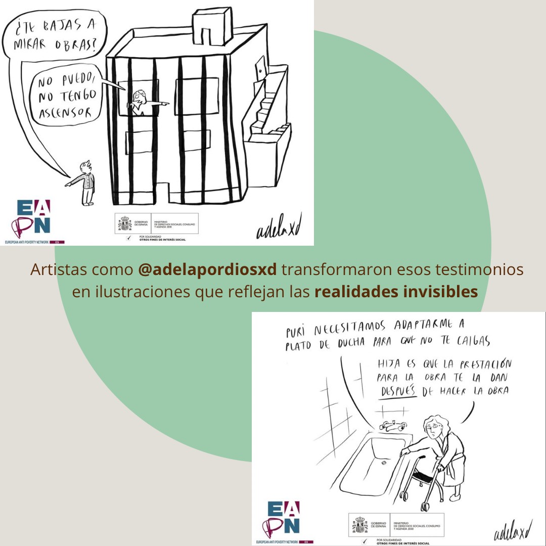 La Red Europea de Lucha contra la Pobreza y la Exclusión Social en el Estado Español está colaborando con ilustradoras e ilustradores, como @adelapordiosxd, para dar voz a través del arte a las conclusiones de su investigación participativa “Envejecimiento, servicios de apoyo comunitarios y entornos inclusivos”