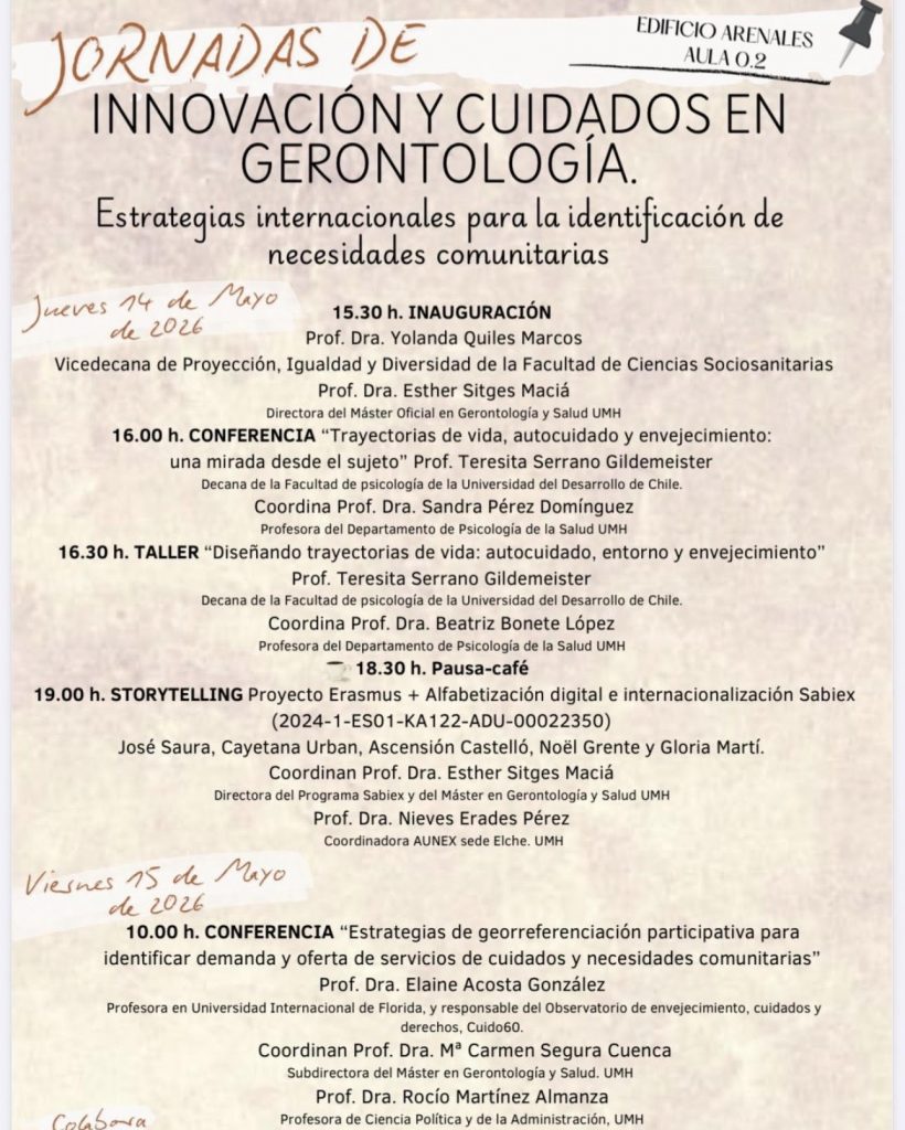 Organiza: Facultad de Ciencias Sociosanitarias, Departamento de Psicología de la Salud, Máster en Gerontología y Salud UMH y @sabiexumh